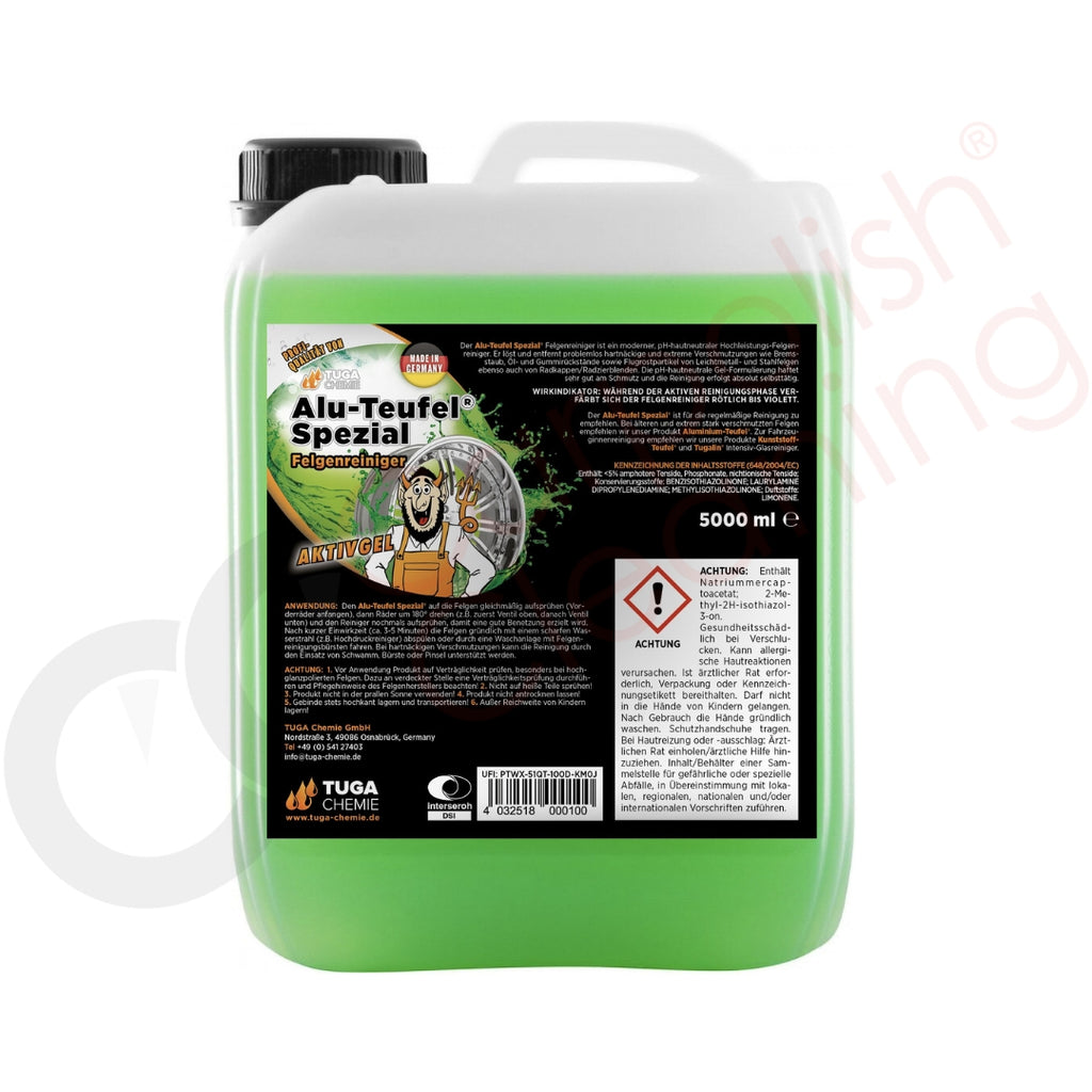 Der beliebte Alu-Teufel Felgenreiniger, selbstverständlich auch bei uns erhältlich. Deine Felgen sind ständigen Umwelteinflüssen ausgesetzt. Dazu kommen noch die Verschmutzungen durch Bremsstaub und Flugrost. Dadurch sehen die Felgen schnell schmuddelig aus. Leider werden die Felgen selten sauber, wenn man sie nur mit Wasser abspritzt. Daher ist ein Felgenreiniger sehr zu empfehlen. Das dünnflüssige "Alu-Teufel Spezial" ist ein modernes Felgenreiniger-Gel für die rasche, sichere und gründliche Reinigung von Felgen aller Art und Materialien. Das Gel haftet sehr gut an der Felge und der Schmutz wird dadurch effektiv angelöst. Während der aktiven Reinigungsphase verfärbt sich der Reiniger rötlich bis violett (Wirkungsindikator). Die Reinigung erfolgt selbsttätig: aufsprühen, einwirken lassen und mit kräftigem Wasserstrahl abspülen. Stark gegen Bremsstaub, sanft zur Felge. Der Alu-Teufel-Spezial® ist säurefrei und somit problemlos für die regelmäßige Felgenpflege geeignet.